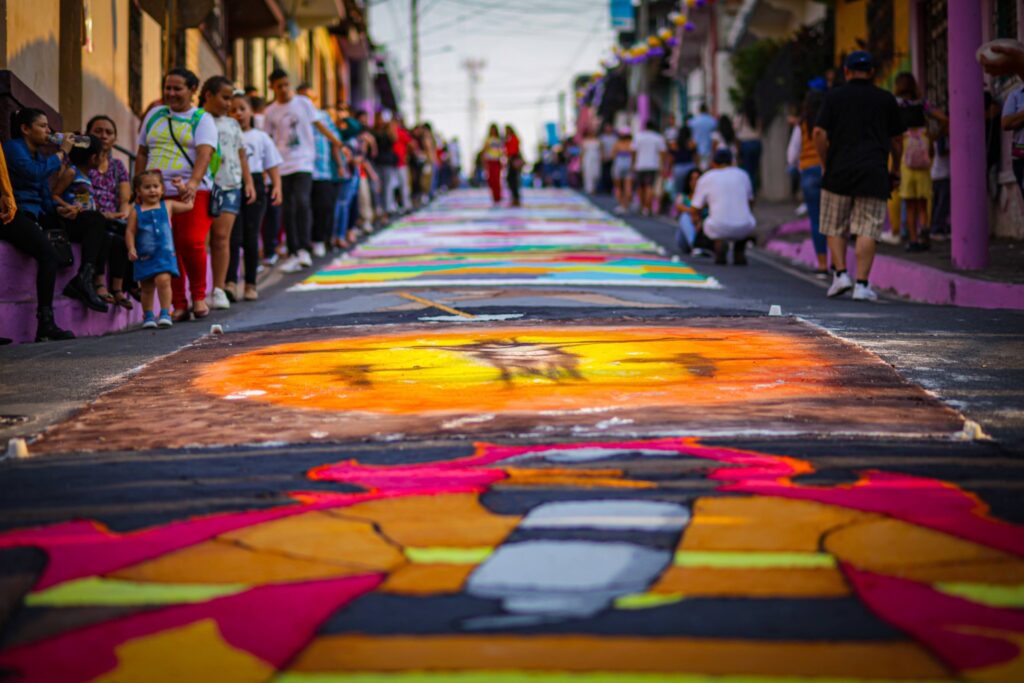 En Sonsonate, declarada “Capital de la Semana Santa”, el nivel de detalle en las alfombras de aserrín es reconocido internacionalmente, mientras que en el renovado Centro Histórico de la capital, el entorno arquitectónico potencia la belleza de estas creaciones. Este arte efímero tiene un propósito espiritual profundo: preparar el camino para el paso del Santo Entierro. Una vez que la procesión cruza sobre ellas, el diseño desaparece, recordando a los fieles la naturaleza transitoria de la vida y el valor del sacrificio y la labor desinteresada en honor a la divinidad.
