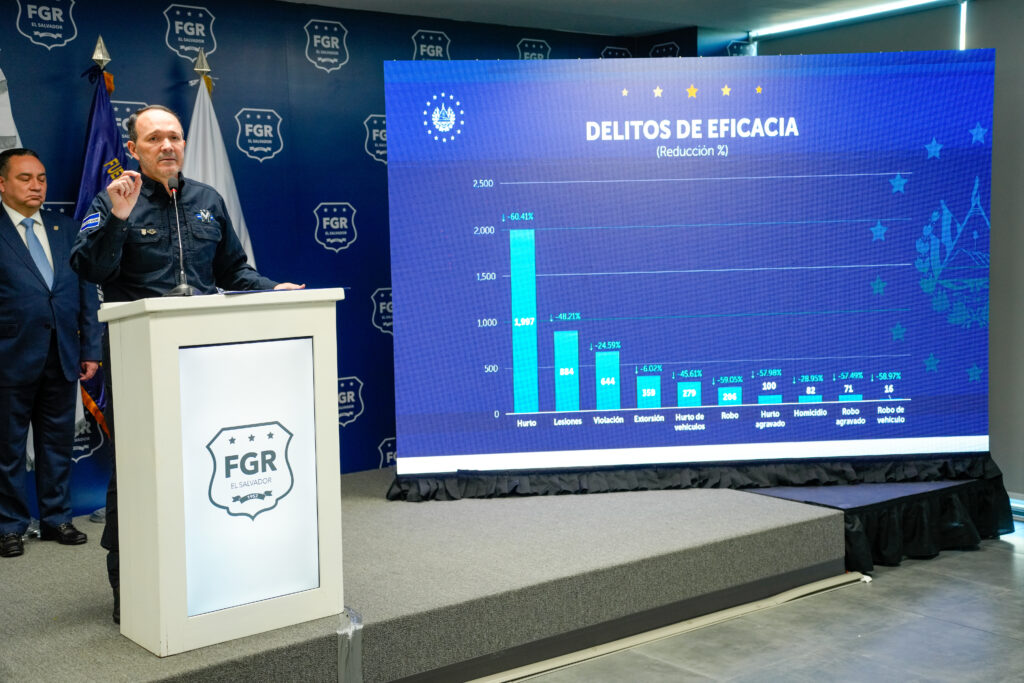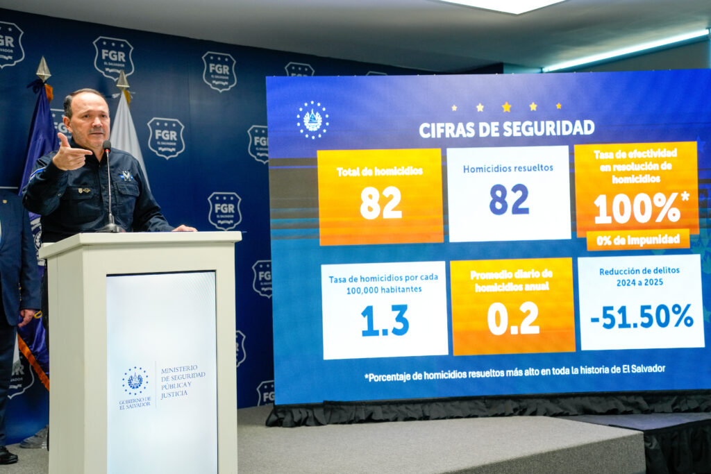 Entre los logros más destacados se reportó una efectividad del 100% en la resolución de los 82 homicidios ocurridos en 2025, el porcentaje más alto de la historia nacional. El Fiscal General, Rodolfo Delgado, subrayó que “en El Salvador ya no hay espacio para la impunidad”.
