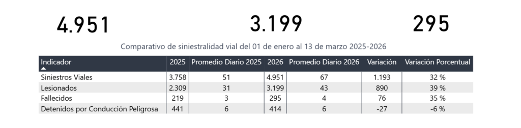 Las estadísticas reflejan una tendencia ascendente que preocupa a la población y a las autoridades. Los siniestros viales han alcanzado la cifra de 4,951, lo que representa un aumento del 32%. Esta situación ha tenido un impacto directo en la salud pública, contabilizándose 3,199 personas lesionadas (un alza del 39%) y 295 fallecidos (un incremento del 35%). En contraste, el único indicador que muestra una leve mejoría es el de los detenidos por conducción peligrosa, con una reducción del 6%, pasando de 441 a 414 casos.